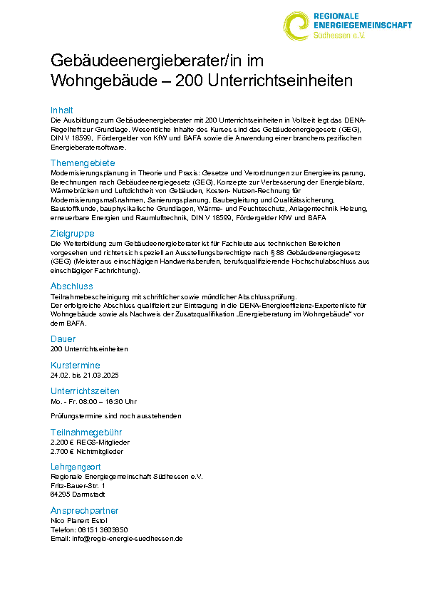 - Kursort: Regionale Energiegemeinschaft Südhessen e.V., Fritz-Bauer-Str. 1, 64295 Darmstadt